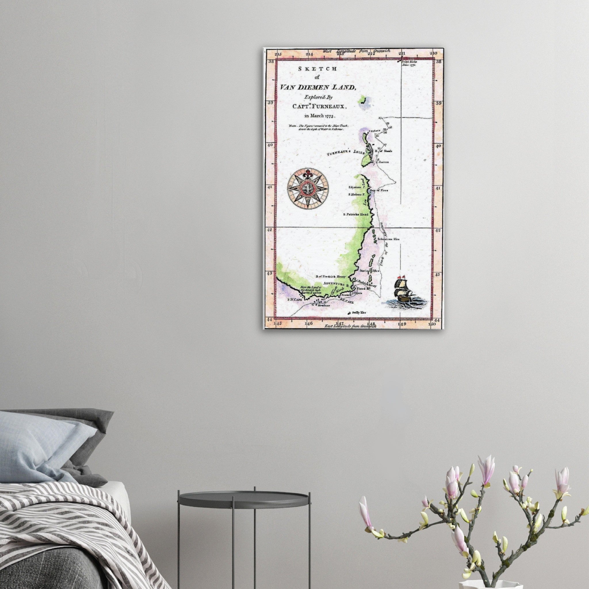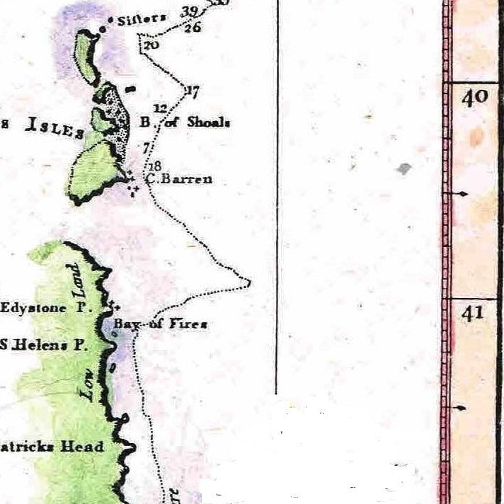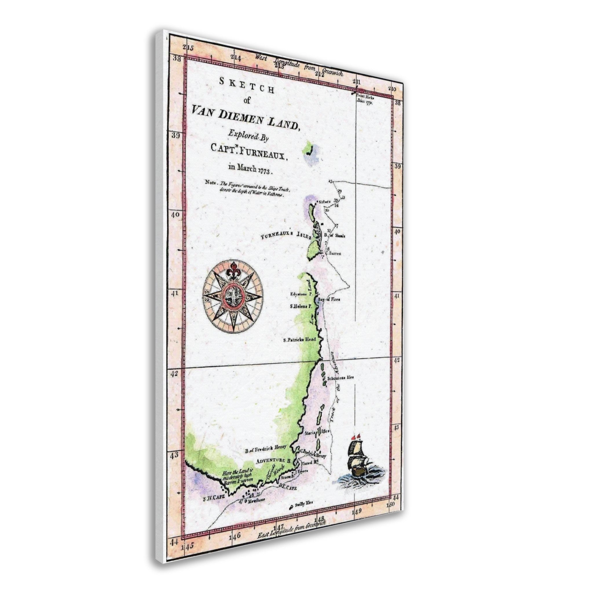 It incorporates the track of H.M.S. Adventure commanded by Lt. Furneaux, from the point of landfall near the present-day Derwent River, up the East coast, then onward into the Pacific.