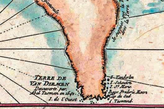 Even in the mid-eighteenth century the complete outline of the Australian continent was only guessed at. Southern Tasmania was firmly on the map but the connection between it and the known South West coast was fanciful. This map includes the coasts discovered and charted more than a century earlier by a series of Dutch navigators including Tasman (West Coast of New Zealand) and Janzoon (West Coast of Cape York Peninsula).