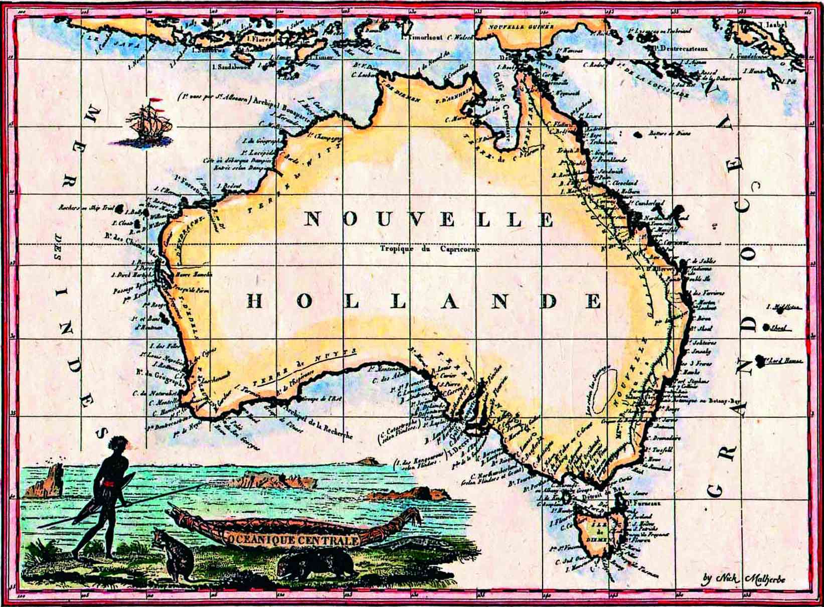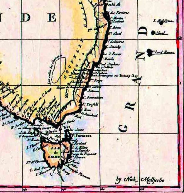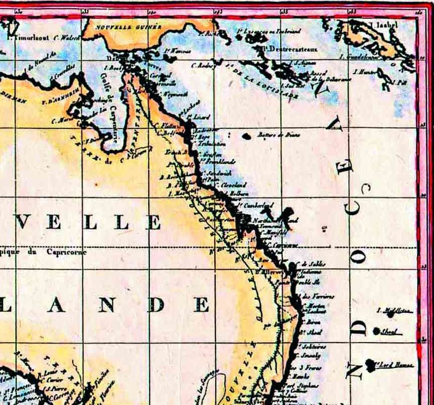 It now shows all the latest discoveries: Bass Strait (Detroit de Bas), Torres Strait (Detroit de Torres), Spencers Gulf (Golfe Bonaparte) and attributes many of the place names by Flinders and the early Dutch navigators - but also names much of the Southern coast Terre Napoleon. The first widely available full map of Terra Australis or Australia, but still referred to as "Nouvelle Hollande" by the French.